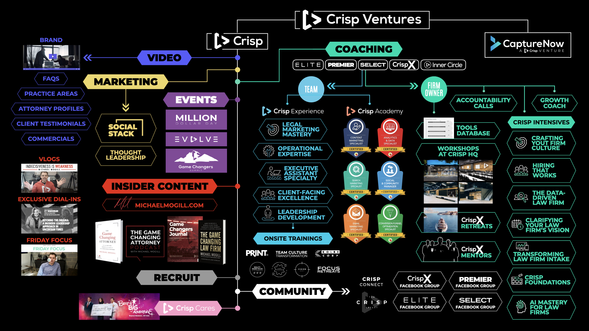 Crisp was founded in 2012 by Michael Mogill with only $500. Through his visionary leadership and commitment to excellence, he has propelled the company to achieve unprecedented growth and success. Crisp equips clients with world-class legal video, relentless digital marketing, the top leadership and management coaching and workshop programs in the legal industry, and proven strategies to empower and align their teams.