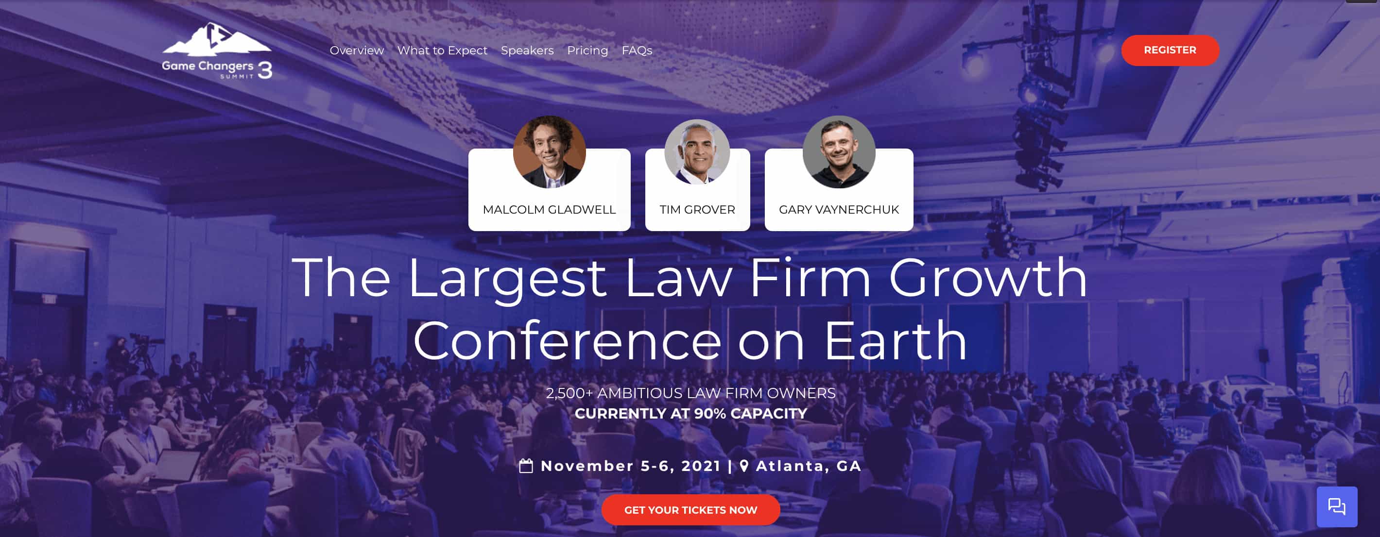 Summit good! Atlanta. November. 2,500+ law firm owners. Actionable insights. Unforgettable connections. Next-level experience. Malcolm Gladwell. Gary Vaynerchuk. Badass. Increase revenue! Firm growth. Meals provided! Tickets running out.