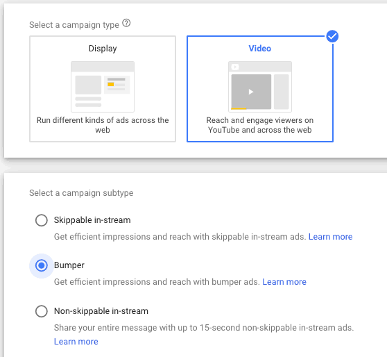 Step 2: Choose the “Video” campaign type and “Bumper” subtype.