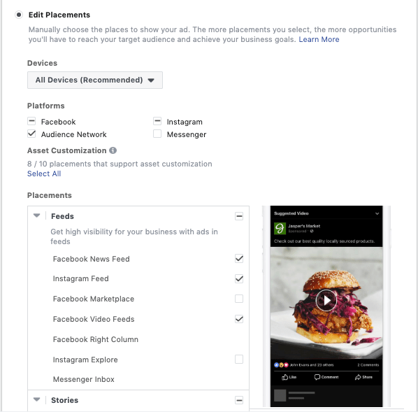 Step 3: Focus on showing your ad in the Facebook and Instagram newsfeeds, video feeds, and in Instagram stories.